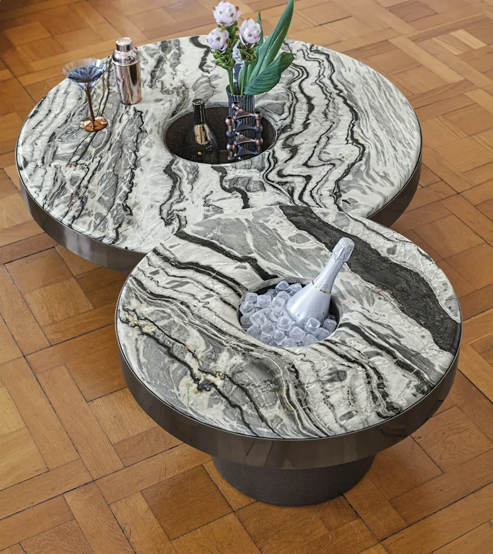 Table basse design haut de gamme That's Life – ArketipoTable basse design haut de gamme That's Life par Arketipo, design Mauro Lipparini, plateaux bois et marbre, disponible chez D-Style Interior.