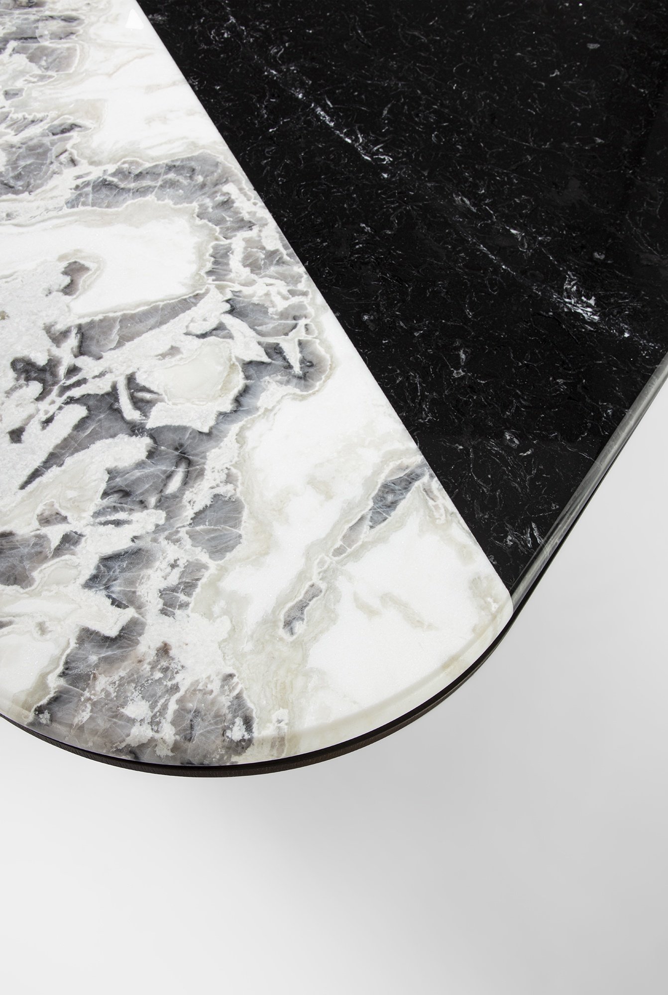 La structure en bois massif, proposée en nuances Wengé ou Tobacco, ancre la table dans une présence visuelle forte tout en équilibrant la richesse du plateau. Sur demande, des variantes Sand, Liquorice ou Greige sont également disponibles, afin d’adapter la table à des univers sobres ou plus sophistiqués. Le plateau, disponible en plusieurs duos de marbres brillants, multiplie les possibilités esthétiques. Parmi les associations proposées, on retrouve Ocean Storm avec Dark Emperador, Dover White avec Nero Marquina ou encore Onice Travertino avec Calacatta Oro. Chaque option met en valeur les veines naturelles et les contrastes de couleur.