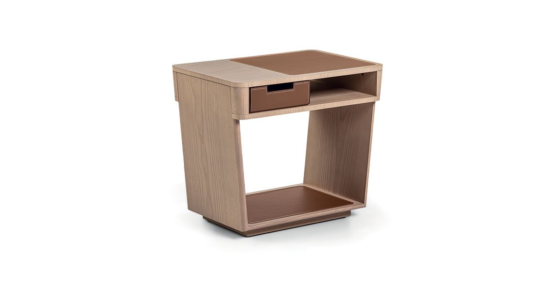 Le plateau et la base intérieure sont habillés de cuir Cuoio avec surpiqûres contrastées, un savoir-faire qui souligne le caractère artisanal de la marque. Cet insert en cuir apporte une texture luxueuse et une identité visuelle forte. L’espace ouvert peut accueillir un tiroir supplémentaire, également revêtu de cuir pour un rendu uniforme et élégant.