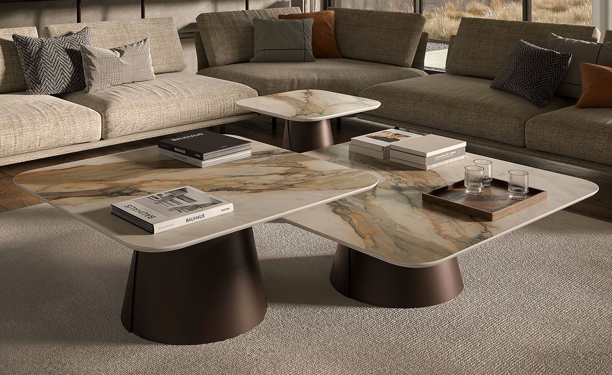 Cette table basse design haut de gamme se décline en neuf dimensions carrées (58x58cm, 100x100cm, 118x118cm) avec trois hauteurs différentes pour chaque format (28cm, 38cm, 48cm ou 34cm, 44cm, 54cm). La base métallique conique, bien qu’apparaissant volumineuse, présente une silhouette élancée grâce à deux détails diagonaux qui évoquent deux plaques d’acier enroulées et superposées. Le plateau en céramique Marmi offre un choix de douze nuances élégantes et luxueuses avec des veinures effet marbre.
