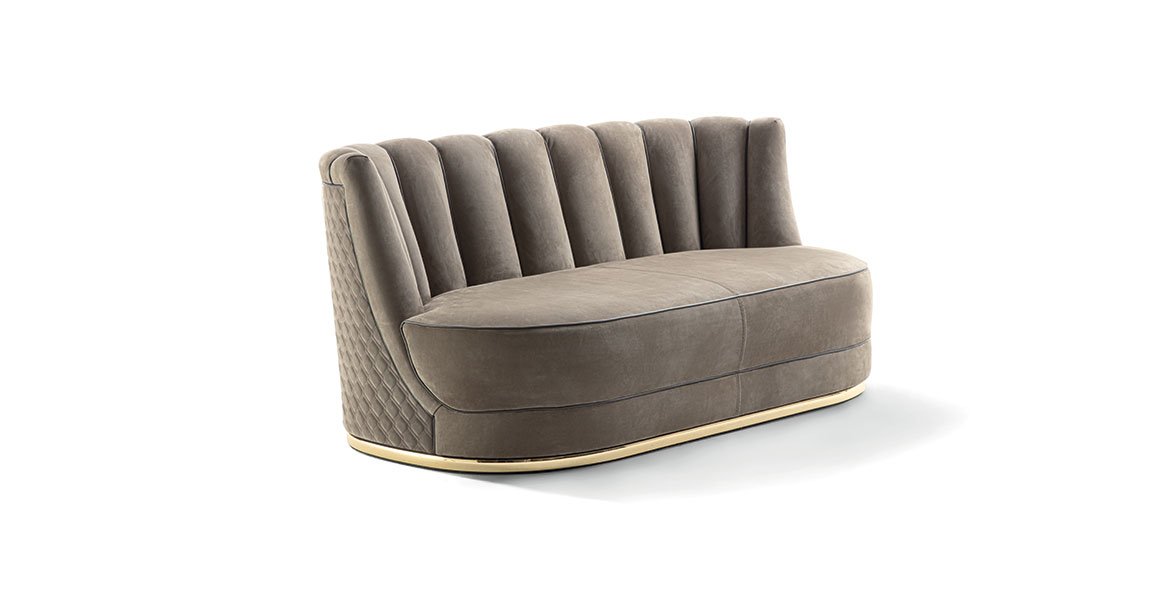 Bianca canapé design haut de gamme par Vittoria Frigerio, avec dossier capitonné, base en or ou bronze brillant et finitions raffinées. Une pièce compacte au confort luxueux. Disponible chez D-Style Interior.
