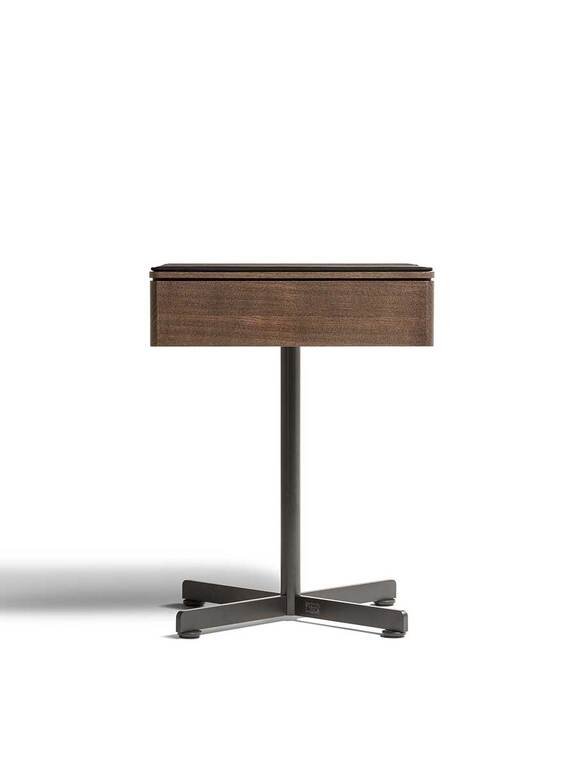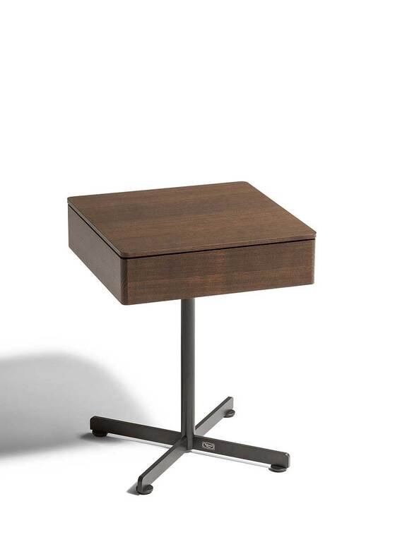 Cette table basse de dimensions 40x40cm présente un plateau et une façade en frêne massif, disponible en finition cendre moka ou noir naturel pour une élégance sobre et contemporaine. Le piétement et le pied sont en acier peint, avec des finitions variées dont le gunmetal qui apporte une touche industrielle sophistiquée. Le tiroir intégré, caractéristique principale de ce modèle, en fait une pièce particulièrement adaptée à la chambre où elle sert de table de nuit idéale tout en maintenant son utilité dans le salon.