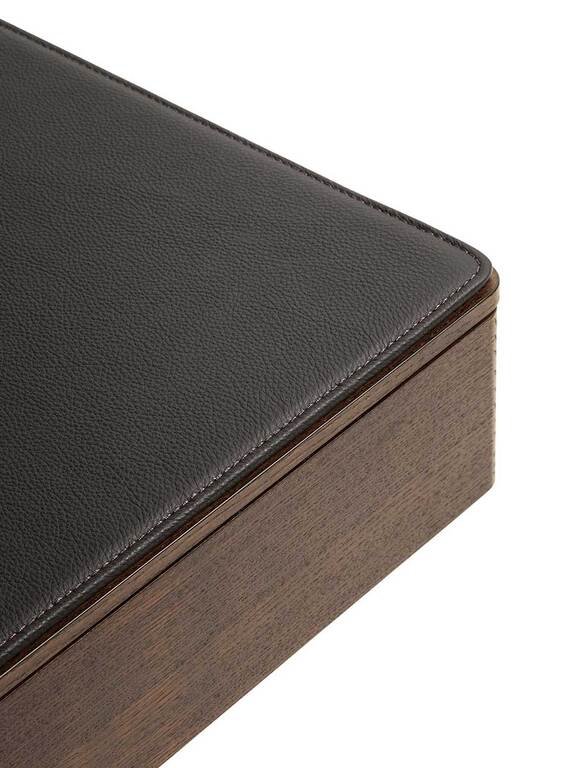 Parmi les options disponibles, un tapis antidérapant beige Alcantara permet de protéger et décorer l’intérieur du tiroir, tandis qu’un tapis en cuir Pelle Frau® légèrement rembourré, avec des coutures ton sur ton ou en contraste, peut être placé au-dessus du plateau pour un confort d’usage supplémentaire. Cette table basse design haut de gamme propose des associations sophistiquées entre le bois massif, le cuir précieux et l’acier peint pour un résultat à la fois formel et désinvolte.