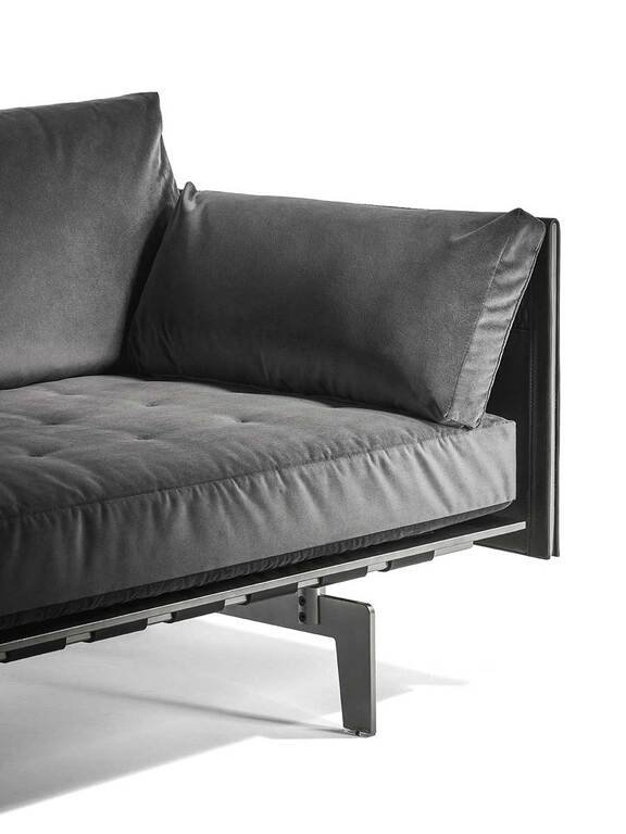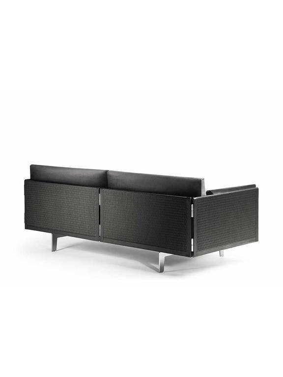 L’architecture légère et évidente du Clayton repose sur une structure innovante de sangles de cuir tressées à la main qui soutiennent et suspendent l’assise. Les coussins présentent des délicates piqûres en X exécutées manuellement avec du fil contrasté, tandis que les panneaux de dossier et d’accoudoirs en acier sont reliés par des charnières métalliques apparentes finition Ruthénium. Les rembourrages en plumes d’oie et les pieds en luge en acier Ruthénium complètent cette œuvre d’art fonctionnelle.