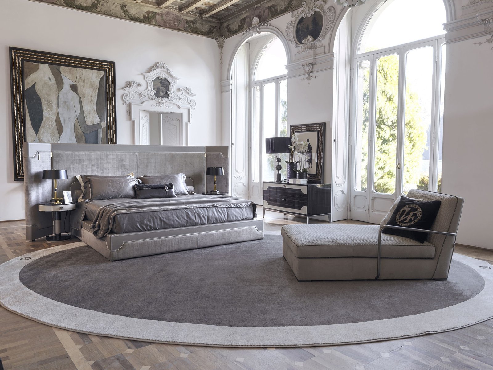 Le cadre du lit reprend cette même rigueur esthétique. Ses lignes droites et équilibrées sont soulignées par des finitions en cuir, créant une continuité harmonieuse avec la tête de lit. Chaque détail exprime un savoir-faire italien d’exception, depuis la qualité du rembourrage jusqu’à la précision des coutures en contraste. La structure repose sur des pieds noirs discrets, apportant stabilité et légèreté à l’ensemble.