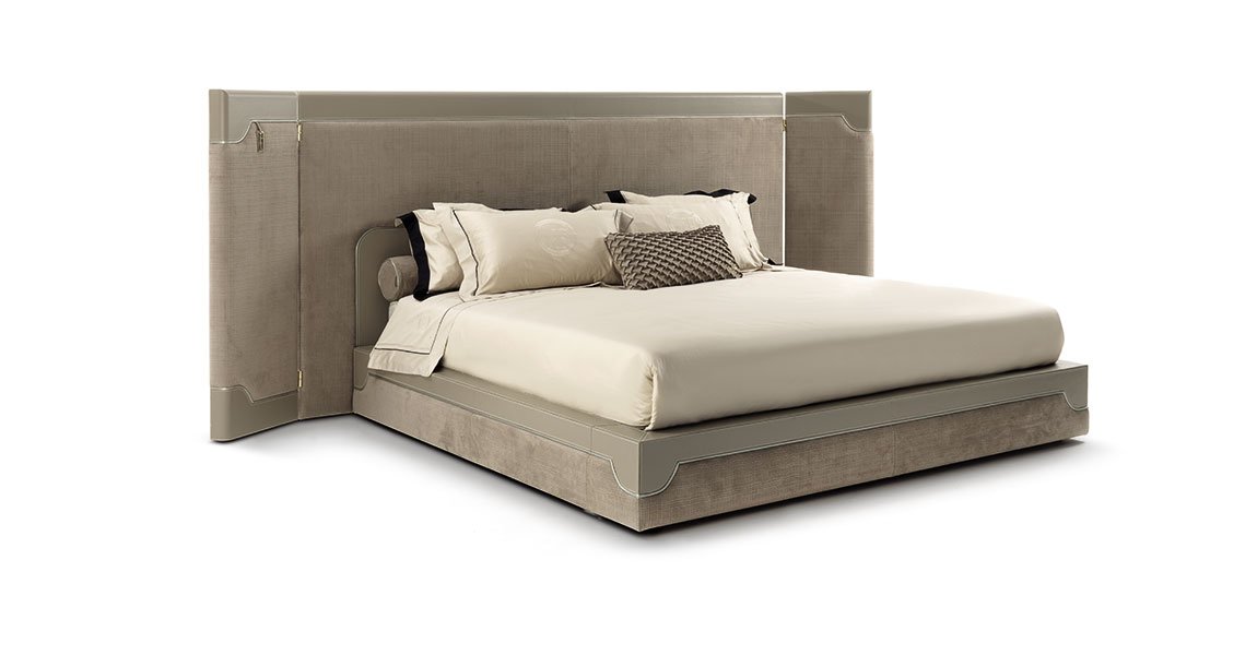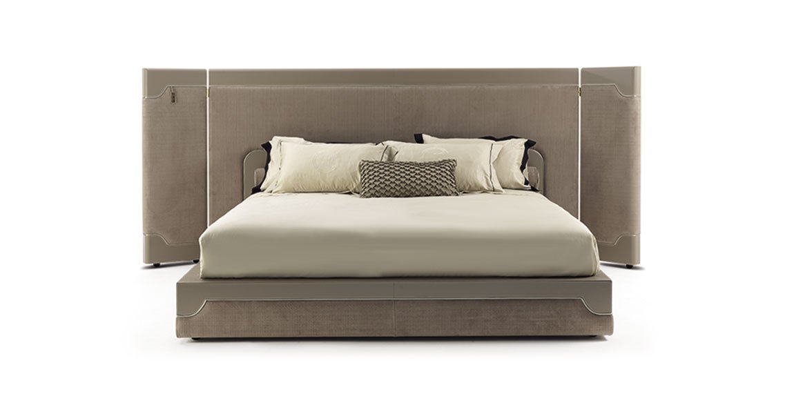 Corio lit de Vittoria Frigerio se distingue par une présence forte et raffinée, pensée pour devenir l’élément central de la chambre. Son imposant dossier, inspiré par l’esthétique des paravents, crée une véritable structure architecturale qui redéfinit l’espace nuit. Les panneaux du dossier sont soigneusement habillés de tissu ou de cuir, tandis que des inserts en cuir Cuoio soulignent la largeur et apportent une signature visuelle élégante.