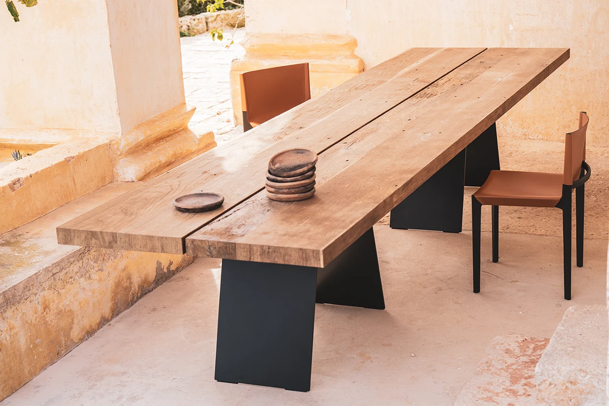 Son plateau, divisé en deux parties, repose sur une base en métal laqué qui évoque la lettre « A » du logo Amura. Cette structure, inspirée des courbes des pavés traditionnels du sud de l’Italie, confère à la table une allure sculpturale et contemporaine. La tension entre la chaleur du bois et la rigueur du métal crée un dialogue harmonieux entre héritage et modernité.