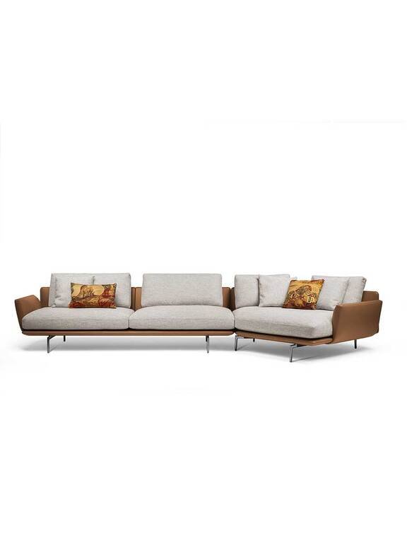 Ce canapé design haut de gamme se distingue par son approche holistique du comfort, avec des coussins d’assise et de dossier aux rembourrages moelleux en plumes créant un contraste intéressant avec les surfaces sculpturales de la structure. La suspension par sangles élastiques tressées et les différents types d’accoudoirs offrent une expérience d’assise personnalisable. La profondeur inattendue des éléments d’angle et la modularité intelligente permettent de nombreuses compositions différentes.
