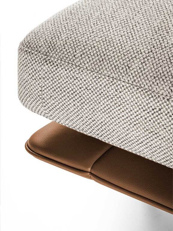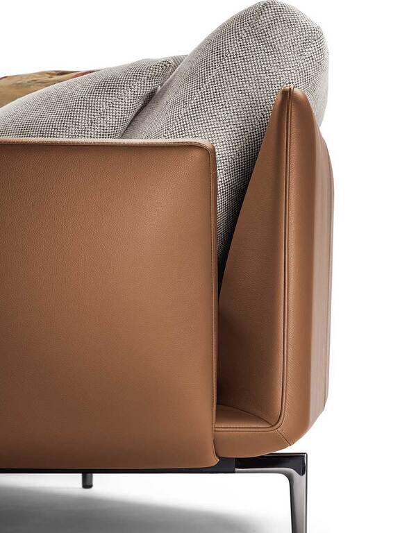 L’assise et le dossier fusionnent en un seul élément léger parcouru d’un passepoil fin qui redessine la silhouette comme un trait de crayon. Les coins arrondis et les lignes généreuses créent des surfaces particulièrement accueillantes, tandis que les accoudoirs en cuir Pelle Frau® enrichis de coutures précieuses embrassent latéralement l’assise. La structure combine hêtre et peuplier massif avec un cadre en aluminium étiré, créant un effet de légèreté suspendue soutenu par des pieds en fonte d’aluminium finition Ruthénium.