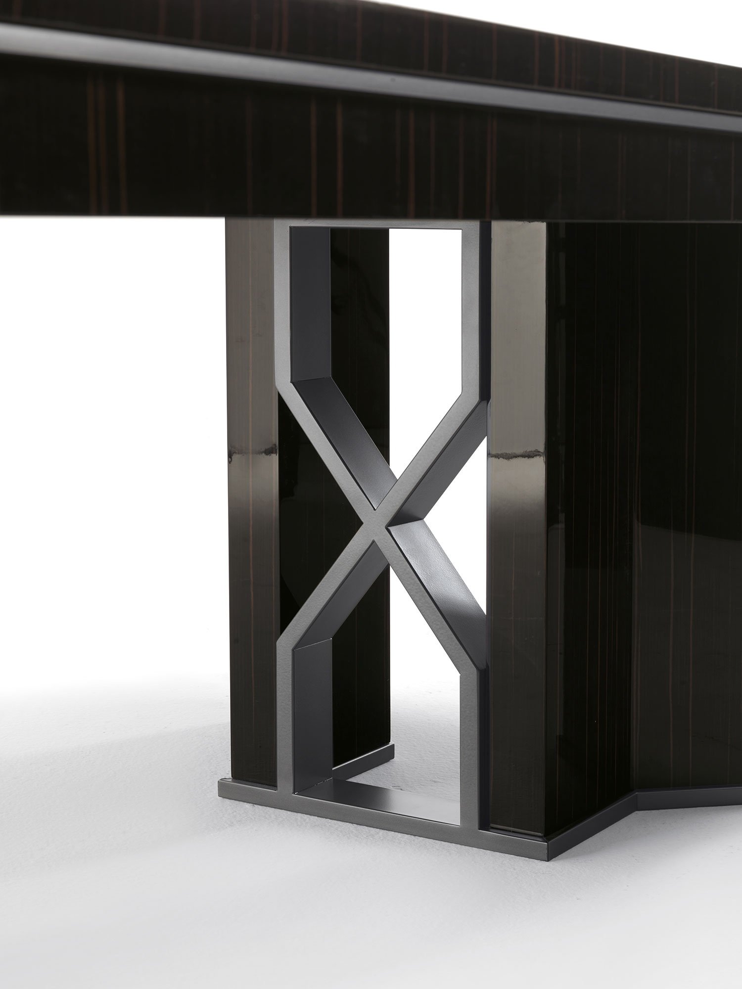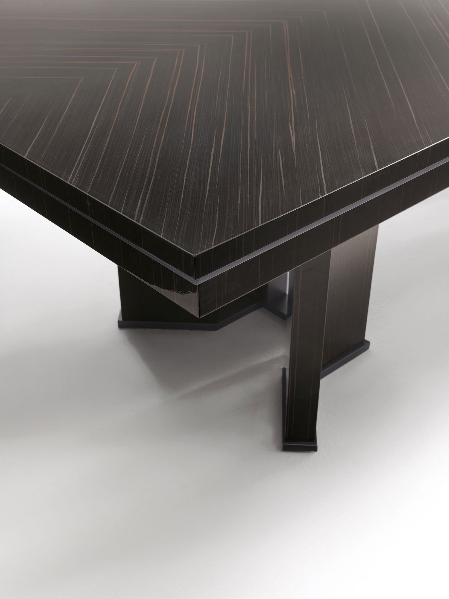 Grimaldi table de Vittoria Frigerio se distingue par sa présence affirmée et son esthétique luxueuse. Conçue pour apporter du caractère à un espace, elle joue sur des proportions solides et sur le contraste entre les matériaux. Sa structure en bois précieux, disponible en érable brillant ou mat ainsi qu’en frêne dans différentes teintes, crée une base élégante et chaleureuse. Les inserts métalliques intégrés dans le plateau et les pieds apportent une touche raffinée et renforcent l’identité haut de gamme du modèle.