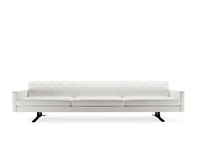 Le canapé Kennedee se distingue par son matelassage léger au motif en X délicatement réalisé à la main avec des coutures contrastées, une expression parfaite du savoir-faire artisanal historique de Poltrona Frau. La structure en hêtre massif sec assure robustesse et durabilité, tandis que le système de suspension par sangles élastiques et le rembourrage en mousse de polyuréthane et ouate de polyester garantissent un confort optimal. Les pieds en acier étiré finition canon de fusil ajoutent une touche industrielle raffinée à l’ensemble.