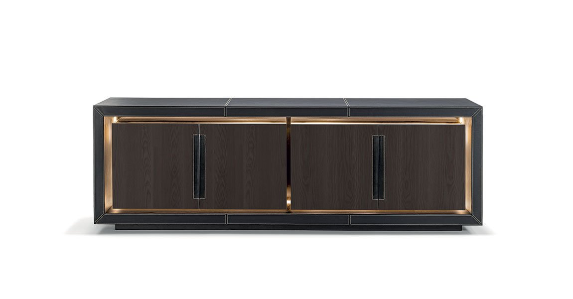 Lanza buffet de Vittoria Frigerio se distingue par une esthétique épurée et un niveau de finition remarquable. Sa structure extérieure est entièrement habillée de cuir Cuoio avec des coutures contrastées, un choix qui renforce le caractère artisanal et la signature élégante de la collection. Ce travail soigné se retrouve aussi dans les inserts en cuir qui forment les poignées, créant une continuité visuelle sobre et raffinée.
