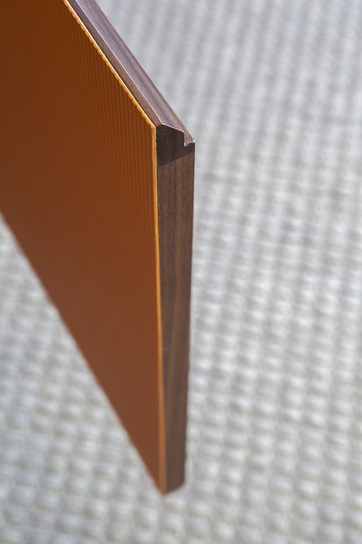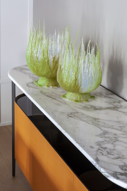 Cette bibliothèque design haut de gamme se distingue par sa surface extérieure recouverte de cuir Saddle Extra orné d’une texture cannetée inédite à rayures verticales qui confère une tridimensionnalité exceptionnelle à l’ensemble. La structure en métal fin mais solide encadre le corps du meuble et sert de lien élégant avec le plateau surélevé en marbre Calacatta Or ou Noir Marquinia. L’intérieur, en plaqué noyer Canaletto, contraste avec les étagères en verre trempé finition bronze qui créent des effets de transparence captivants, tandis que le système d’ouverture accordéon des quatre portes offre une accessibilité optimale.