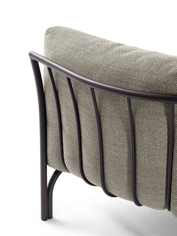 Le cadre en aluminium laqué embossé, particulièrement léger et facile à déplacer, est ponctué de fins éléments métalliques qui créent un rythme visuel élégant – plus épais sur les accoudoirs, plus espacés sur le dossier. Les coussins d’assise, de dossier et d’accoudoirs sont reliés à la structure par des sangles permettant un positionnement et un retrait rapides. Les coussins d’assise en matériau drainant et les housses entièrement déhoussables en Pelle Frau® Outdoor ou tissu Outdoor garantissent confort et praticité.