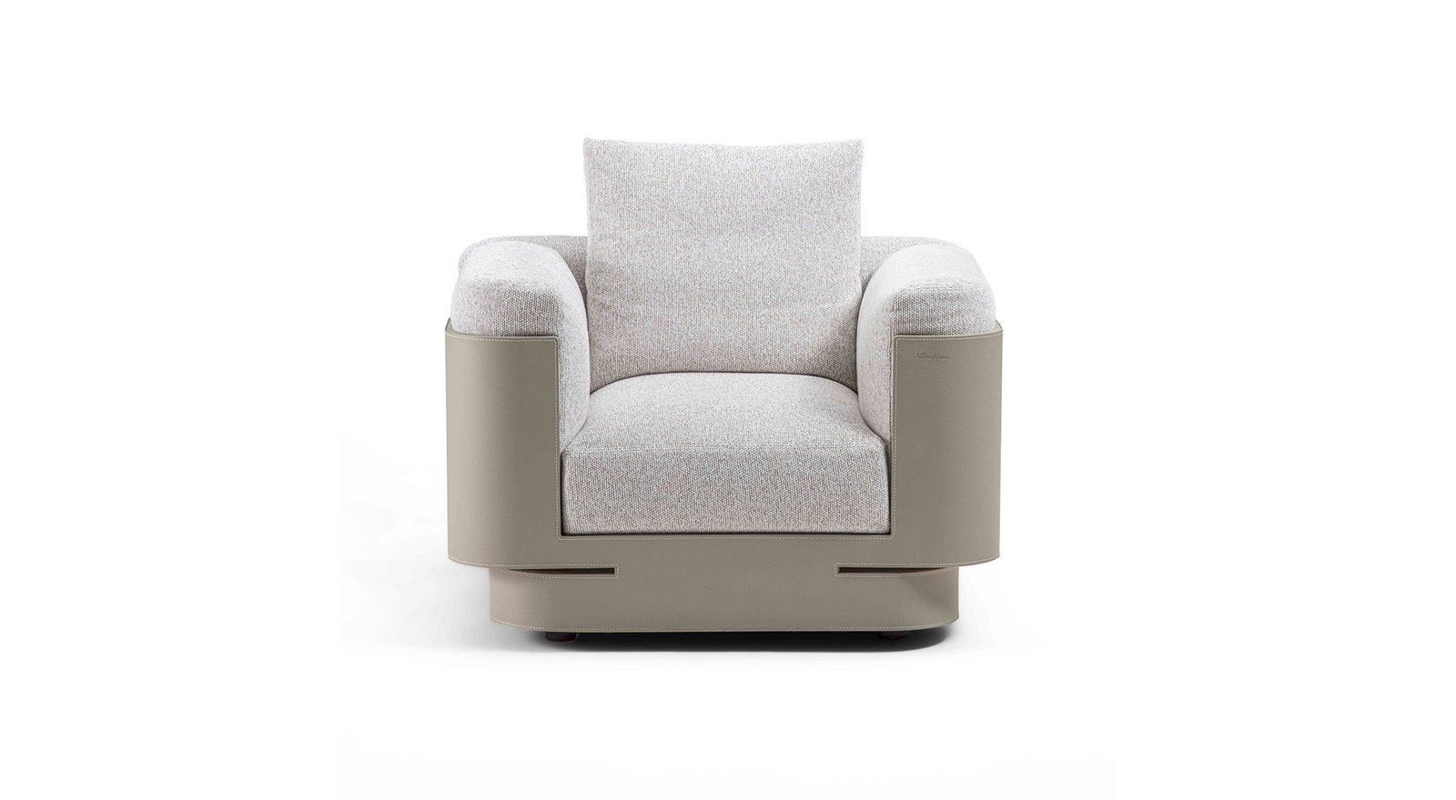 Le socle en cuir, prolongeant son tracé jusqu’à l’avant des accoudoirs, enveloppe la silhouette d’un geste fluide, évoquant un savoir-faire de haute maroquinerie. L’assise, généreusement rembourrée en mousse à mémoire et plumes d’oie, assure un confort enveloppant et durable. Ce dialogue entre structure et souplesse fait de Necchi bien plus qu’un fauteuil : un manifeste de l’art de vivre italien, où la beauté se mesure à la justesse du détail.
