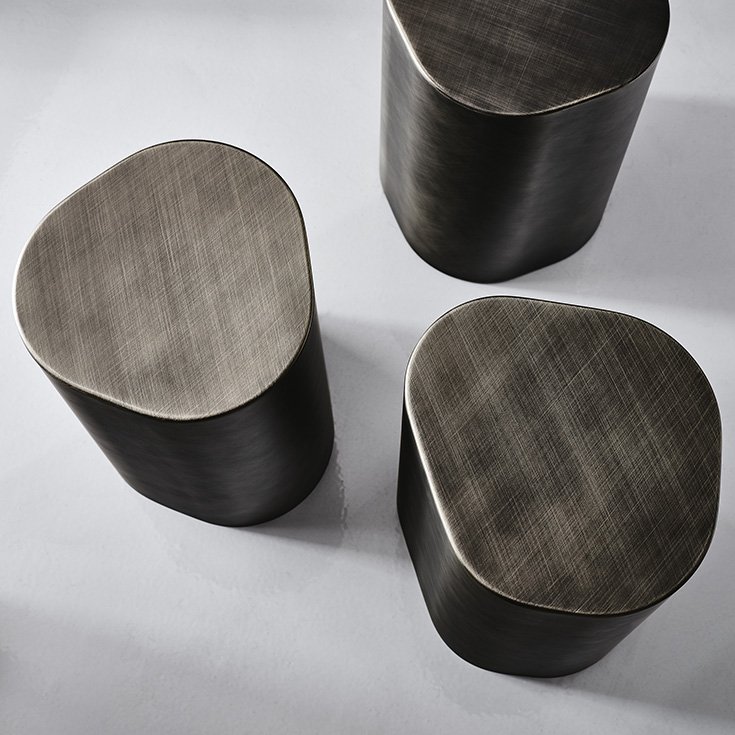 Cette table basse design haut de gamme est conçue pour être placée à côté de fauteuils et canapés, supportant lampes et éléments décoratifs tout en apportant une touche de design disruptif à un salon moderne. Les trois modèles de la collection, avec des formes variées mais des dimensions similaires (environ 30x30x45h cm), peuvent être combinés à volonté pour créer une composition personnalisée idéale. La finition Brushed Bronze ou Brushed Grey confère à chaque pièce un caractère unique et artisanal.