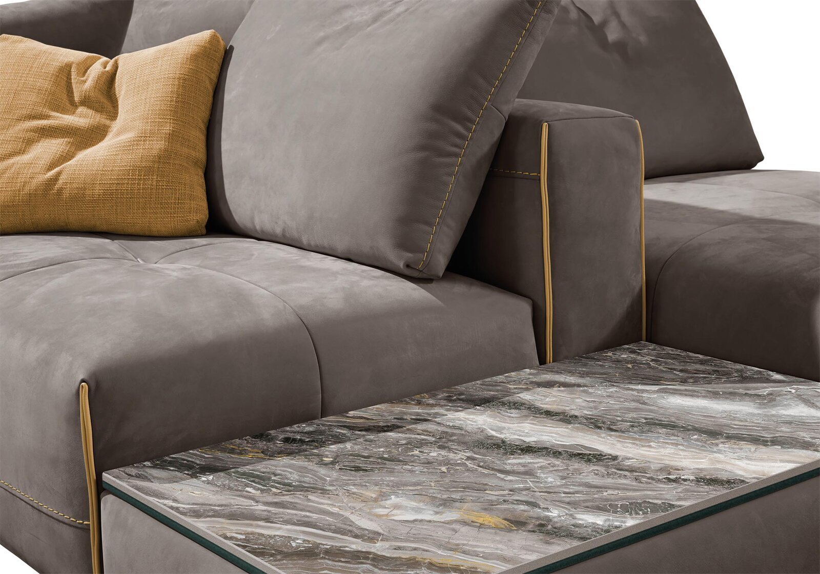 Fabriqué à partir de matériaux haut de gamme, le canapé se distingue par son confort exceptionnel et ses finitions raffinées. Les assises généreuses associent plusieurs couches de polyuréthane et un garnissage moelleux en plumes pour un confort durable. Le savoir-faire artisanal de Gamma se révèle dans les surpiqûres capitonnées et les détails en cuir qui ornent le centre et les côtés des coussins, ajoutant une touche de sophistication discrète et élégante.