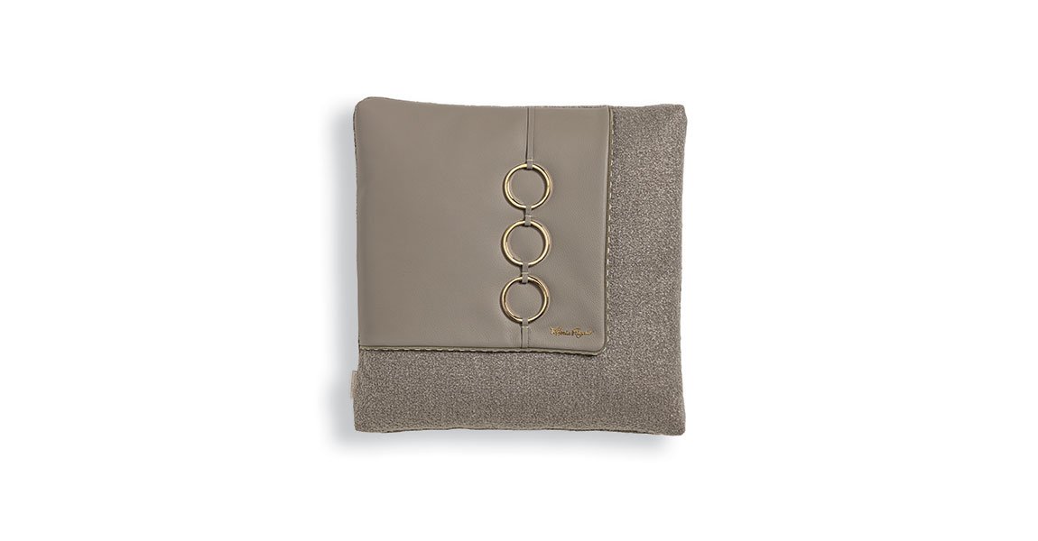 VF02 coussin design en tissu précieux avec détail en cuir et fermoir métallique, disponible en trois couleurs. Disponible chez D-Style Interior.